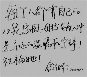 由于日程安排很满,一直想回母校看看的心愿这次又无法实现了,舒楠对此表示抱歉和遗憾。他说,争取下半年母校举行60周年校庆时,回母校多呆两天,与老师、同学好好聚聚。他提笔为滁州学院题词:“每个人都有自己的心灵家园,母校在我心中是永远的温暖和宁静!祝福她!”