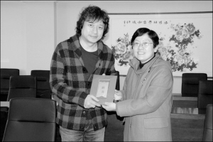 邱克还为舒楠颁发了客座教授聘书,舒楠则回赠了他创作音乐的电影《建国大业》、《香巴拉信使》碟片和《接你回家》音乐光盘。
