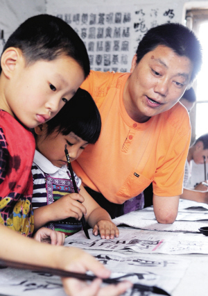 赵靖临走前不忘辅导他的书画培训中心的孩子。