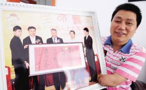 赵靖展示2009年10月在澳门向时任特首的何厚铧赠送书法作品图片。
