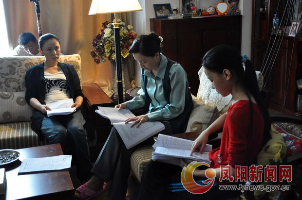 张恒(左一)与小陶红正在拍摄间隙熟悉台词