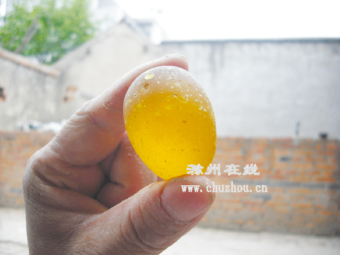 俗语说“鸡蛋碰不过石头”,但天长市金集镇王先生家母鸡下的一颗鸡蛋却和石头一样硬,“通体金黄,怎么敲击都不会碎,敲打时还会发出像石头一样的‘梆梆’声。”王先生称家里的母鸡从来没下过这样的蛋,周围邻居见了都感觉很奇怪。记者随后咨询了安徽科技学院的王力克教授,王教授称可能是母鸡产蛋时发生病变,蛋壳没有包裹住蛋黄,蛋黄缺少水分长时间存留在母鸡体内形成的。