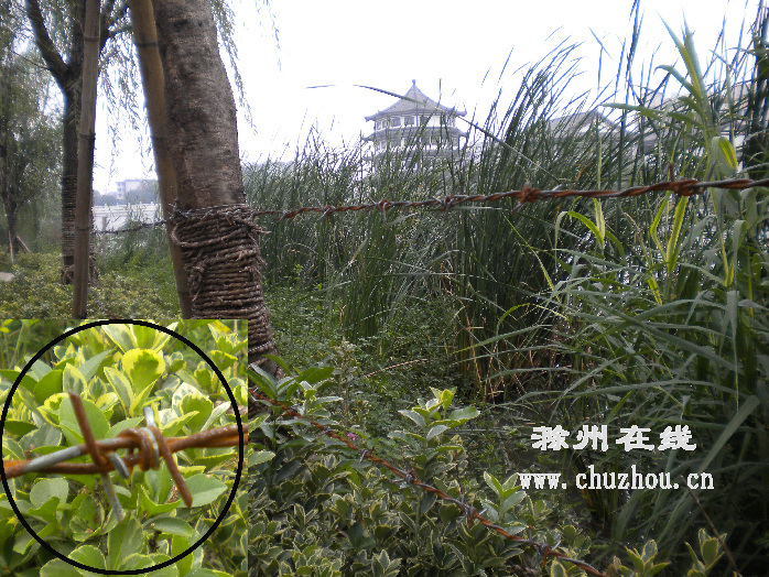 记者包增光核实报道:记者随后赶到,从南谯北路西侧小广场进入公园,沿着湖边寻找,果然发现此处扎着两排铁丝栅栏。栅栏扎在岸边树木上,由于日照雨淋,一段段的铁丝已经锈迹斑斑。危险的是,由于铁丝扎成“铁蒺藜”的形状,人或动物一旦碰上,很容易被划伤。