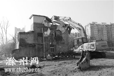 图为琅琊区城管执法局正在组织机械拆除房屋情景。