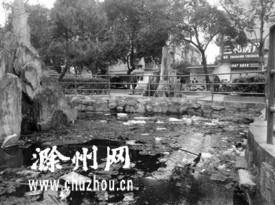 昨天上午,滁州网记者来到凤凰一村小公园,看到该公园约二三百平方米大小,其北侧是一片健身广场,南侧是两个一大一小连成一体的景观池,景观池四周拉起了铁制护栏。走近景观池,池中的景象不禁令人大跌眼镜:池水呈暗绿色,水池边缘长满了青苔;塑料袋、烟盒纸、饮料瓶……池中的水面上漂浮着一层白色垃圾。虽然冬季气温较低,但风一吹,记者仍然能闻到一股臭味。