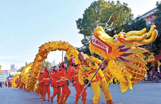 2月11日,来安县半塔镇女子龙灯队在民俗花灯调演及“踩街”巡游活动中表演《金龙狂舞》。王家国 赵正平 摄