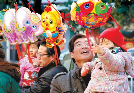 2月11日,正月十五元宵节,淮北市民在挑选传统手工和中国生肖元素花灯。李鑫 摄