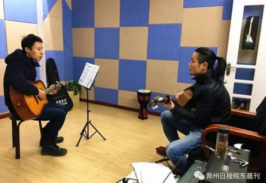 走进滁城丰乐大道第五中学对面的一家琴行,练音房里不时有吉它声音传出,简单的旋律流畅悦耳却略显生涩,15岁的初中生小汪正在房间里认真弹奏着。记者采访的当天,本应开学上课的小汪,并没有去学校上课。一开始记者有些讶异,难道是“翘课”学吉它?后来的聊天中,腼腆内向的他才向记者说出,因为身体原因,他病休了一段时间,但是又不想一直呆在家里浪费时间,2016年底,在征求了父母的同意后,他便来到了琴行学吉它。虽然刚刚上了几节课,小汪已经十分喜爱弹吉它,一有时间,便会来到琴行练习,一练就是两三个小时。对小汪来说,音乐像是把钥匙,为他开启了一扇门,一扇通向更为开阔的人生的大门,在音乐的世界里,年轻的他找到了自己的一份“乐在其中”。