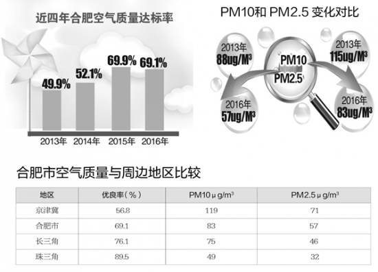 根据统计,从合肥市2013-2016年监测结果来看,空气质量达标率由2013年的49.9%、2014年的52.1%、2015年的69.9%,达到2016年的69.1%,虽然2016年的达标率小幅度下降,但空气质量逐年稳步好转。