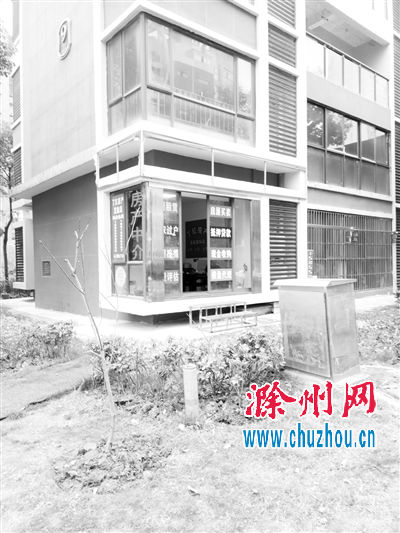 3月29日,滁州网记者来到发能国际城小区,从北门一进入,记者就在入口旁的一栋楼下看到一间“中介超市”的门店。门口摆放着一些矿泉水、牛奶等商品,门前的绿化带上被开出一条便道,上面铺着绿色的垫子。和同一层其它户型不同的是,只有这一户朝南的方向有一个“门”,其他的户型都是密封的阳台或窗户。继续往小区里面走,记者又看到多家房屋中介和便利店开在小区的一楼,同样是将阳台或窗户改造成可以进出的门。记者以租房的名义进入一家房产中介,当记者质疑该店为何没有营业执照时,店内的接待人员解释,“我们总共有三个门店,执照在另外一个店里,没有放在这边的店里。”