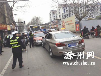 当天早晨,滁城鲜鱼巷口,一辆宝马轿车逆向行驶,撞到一辆正常行驶的红色出租车。紧随红色出租车后面的另外一辆蓝色出租车猝不及防,也与前方车辆发生追尾。事故发生后,两辆出租车驾驶员下车查看,发现宝马轿车司机竟趴在方向盘上昏睡不醒。大家猛拍其车窗玻璃,宝马车司机这才猛然惊醒,知道闯祸撞车了。