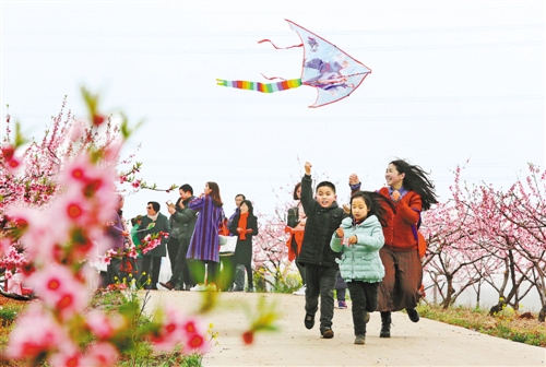 游客在安徽滁州市来安县张山乡仰山村千亩桃园踏青赏桃花。近年来,来安县依托山区优势开发生态农业项目,并带动乡村休闲旅游发展,实现了农业与旅游业的效益共赢。 李晓村摄