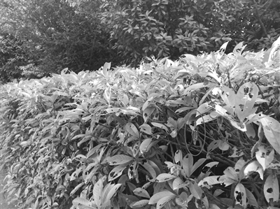 近日,家住清流公园附近的李女士在散步时发现,公园边上靠近南谯路与清流路交叉口的绿化植物上有被虫子啃食的痕迹,但却没见到虫子在哪里。李女士觉得奇怪,便拨打电话向本刊反映:“这边的绿化不知道生了什么虫子,叶子都被啃坏了,希望有关部门能来防治一下,不要让虫害扩散!”
