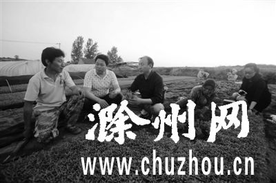 日前,定远县拂晓乡乡政府帮扶责任人张维公在了解贫困户张树俊育苗销售情况。