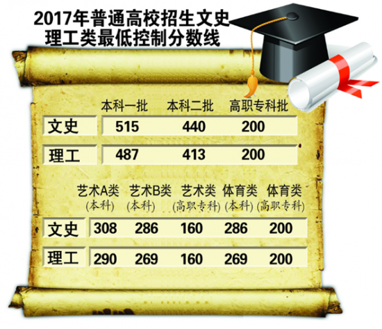 与2016年相比,今年各批次录取最低控制线略有降低。省教育招生考试院新闻发言人胡雨生表示,主要原因是今年教育部考试中心修订了《考试大纲》,在考试范围、试卷结构和分值、题目难度上较上年有所提高,尤其是综合科目平均分下降较多,“但总体上说,一些题目情境新颖、考查灵活,具有较高的效度和区分度。此外,分数线的下降也和今年考生人数有所减少,招生计划有所增加有一定的关系。”