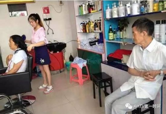 7月14日记者在她的理发店采访时,一上午,王雅君忙着给顾客洗头、理发,墙上的十字绣钟滴答滴答地走着,爷爷就这么静静地坐在一旁,看着孙女,眼神里满是怜爱。