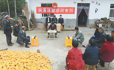 图为涧溪“巡回法庭”的法官在大山深处的杨港村农家小院开庭审理一起民事案件。