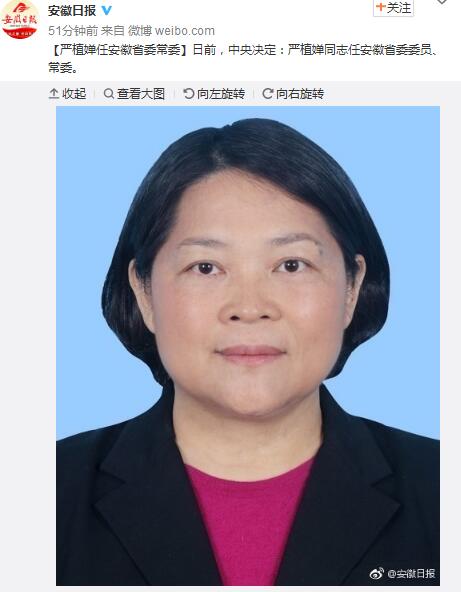 日前,中央决定:严植婵同志任安徽省委委员、常委。