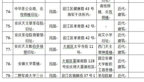 除严凤英旧居、诸永盛酱园旧址、合记义和染坊旧址、雷家老屋传统民居、劝业场旧址等之外,安徽大学青楼、国营安庆香皂厂旧址等也被公布为保护性建筑。
