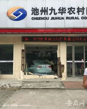 据警方介绍,9月10日下午1点左右,池州市公安局交警支队直属二大队殷汇中队接到群众报警称:一辆小轿车撞倒一行人后,又撞进九华农村商业银行的办公区。民警接警后迅速到场看到一辆挂临时号牌的白色大众新车撞到银行办公区的柜台上,银行的一面玻璃墙被撞碎,齐刷刷地铺在肇事车辆上,银行大厅里的部分设施被损坏。