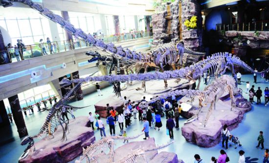 ◆ 10月1日,位于合肥市政务区的安徽省地质博物馆内,人们在参观大型恐龙骨架。当日是国庆假期第一天,许多市民带着孩子走进科普场馆,学习知识,开阔眼界。本报记者徐旻昊摄