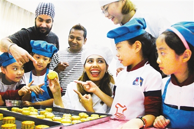 中秋节之际,河北唐山市丰润区,来自英国、印度、孟加拉国的外教老师与当地的孩子们一起制作月饼,体验中华民族传统文化。