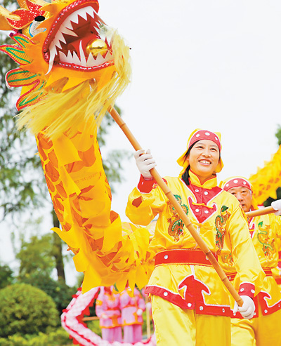 10月4日,舞龙队成员在江苏南通市啬园进行传统民俗舞龙表演,欢度中秋佳节。