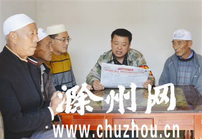 ◀10月20日,南谯区章广镇孟洼村党总支书记带领回民同胞学习十九大报告,把十九大报告精神及时地传达给少数民族群众。通过学习,大家纷纷表示,永远跟共产党走,做好民族团结工作,发展民族经济,早日步入小康。