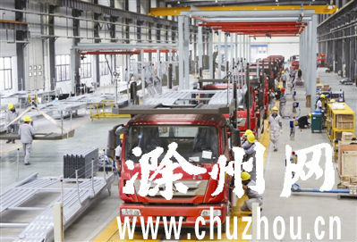 落户苏滁现代产业园区的长久(滁州)专用车汽车有限公司滁州生产基地一期投资5.6亿元,去年6月开工建设。10月12日正式竣工投产,月组装中置轴轿运车近400辆。该产品是国内首台通过燃油公告的中置轴车辆运输车,国家政策支持更新换代产品。图为长久专用车生产线一派繁忙景象。