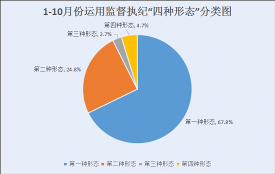 1-10月,全市纪检监察机关共运用监督执纪“四种形态”处置3487人次。其中,第一种形态2365人次,占67.8%;第二种形态865人次,占24.8%;第三种形态92人次,占2.7%;第四种形态165人次,占4.7%。