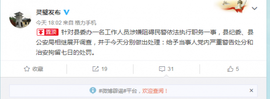 12月10日18时许,灵璧县政府办通过官方微博@灵璧发布 对外通报称:“针对县委办一名工作人员涉嫌阻碍民警依法执行职务一事,县纪委、县公安局相继展开调查,并于今天分别做出处理:给予当事人党内严重警告处分和治安拘留七日的处罚。”