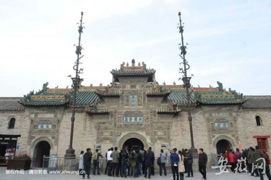 亳州花戏楼是国家级重点文物保护单位。山门上镶嵌有大约150块玲珑剔透的水磨砖雕。戏台上有精妙绝伦的三国戏文,大小木雕近一百块。砖雕、木雕和山门前的旗杆一起被称为花戏楼“三绝”。