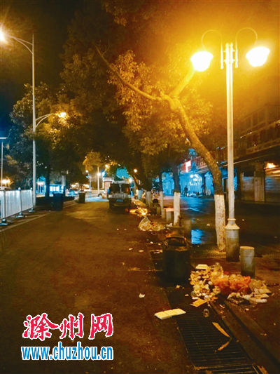 滁州网讯 升级改造后的琅琊路十分美观,成为城市建设的一大亮点,然而有人却给这张名片抹了黑。近日,滁城市民潘先生向本刊反映,琅琊路铜矿转盘东侧有一排大排档,每天夜间营业后,将残羹冷炙随意倒入路边的垃圾桶中,路面上也是污迹斑斑,散发出阵阵难闻的味道,过往市民烦心不已。记者随后前往现场对此事进行了采访。