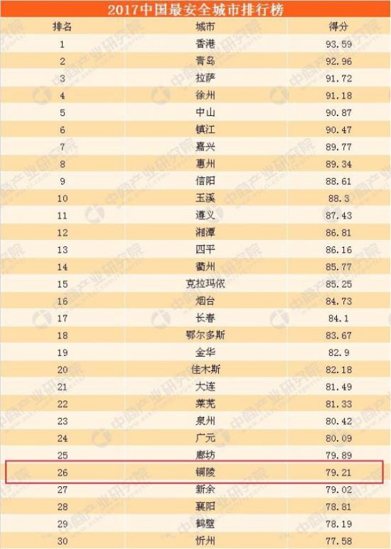 2017年12月21日,中国城市竞争力研究会发布了2017年中国最安全城市排行榜。铜陵市成功跻身该榜单,位列第26位,成为了全国最安全城市之一。铜陵市也是整个安徽省唯一入围的地级市。