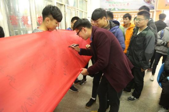 90名男生在横幅上签名送给3名女生做纪念。(文/刘敏 图/余康生 刘敏)