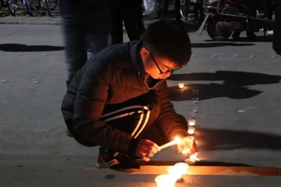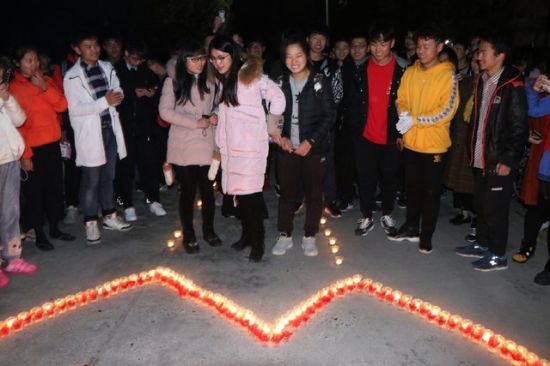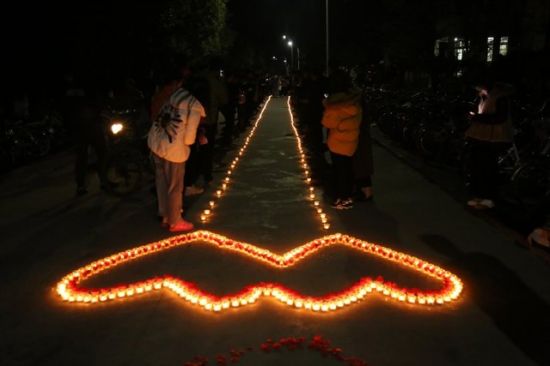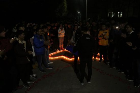 2017年12月24日,安徽安庆,安庆师范大学机械设计制造及其自动化2017级90名男生在女生寝室楼下摆出450根蜡烛为3名女生过生日。