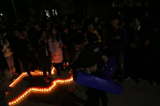 自觉形成“人墙”的90位男生和观众站在蜡烛的两排等待3位“女主角”的出现。