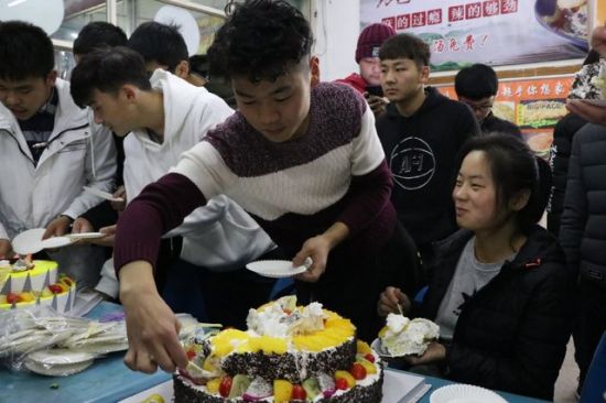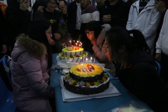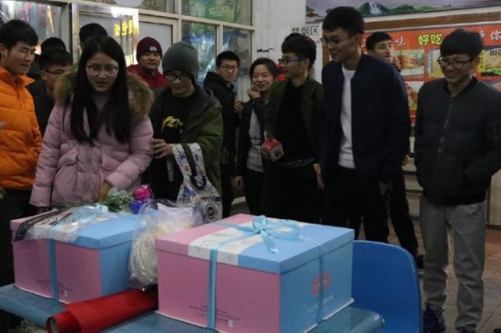 90名男生把女生带到食堂为他们准备另外一份惊喜——生日蛋糕。