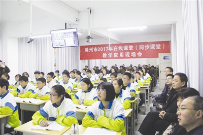 2017年11月17日,滁州市首届中小学教师在线课堂(同步课堂)教学应用大赛圆满举行。图为凤阳县第三中学交流会现场。