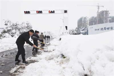 与此同时,区城管部门启动应急响应,对南谯路、湖心路、东坡路、龙蟠大道、中都大道、乌衣政务新区周边等交通要道实施扫雪除冰作业。集中摸排辖区内重要场所市政设施,清除积雪,排除安全隐患,并快速将损伤倒地的行道树枝搬离主干道,确保车辆和行人出行安全。区农委迅速成立雨雪冰冻灾害应急小组,安排技术人员深入田间地头开展灾害天气保苗增产指导,加强对粮企老旧仓房检查巡查工作,针对存在的隐患点做好整治,确保人员、仓房、储粮的安全。区园林部门组织30多人的专业队,对南谯新城常绿大树集中开展积雪清除工作。