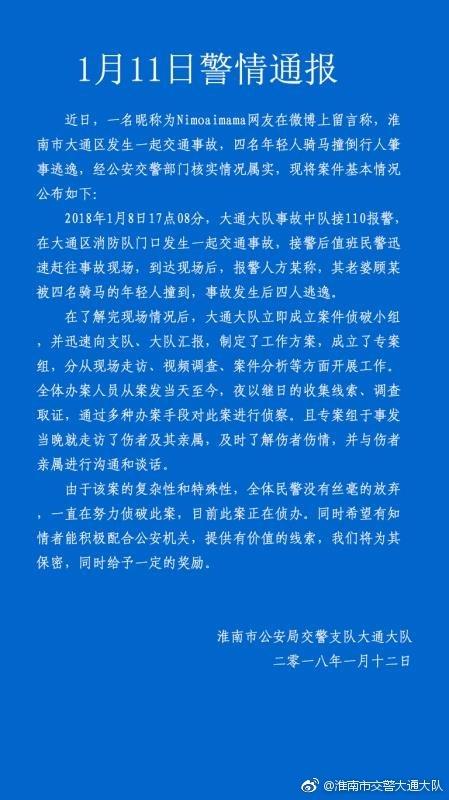 近日,有网友在微博上留言称,淮南市大通区发生一起交通事故,四名年轻人骑马撞到行人肇事逃逸。
