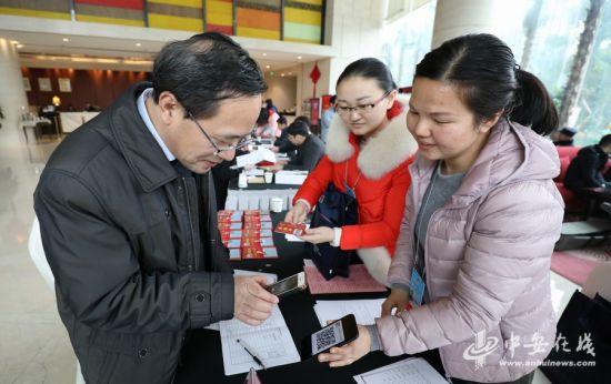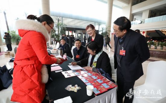 1月19日下午,在泓瑞金陵酒店,参加安徽省十二届政协会议的政协委员们在报到台签到