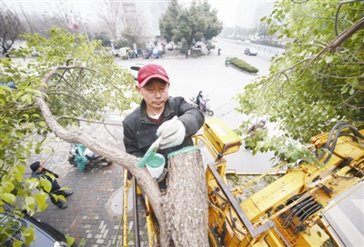 1月18日,园林工人在滁城清流路为受损树木伤口上涂抹伤口愈合剂。受暴雪影响,滁城街头很多绿化树木遭到断枝、倒伏等伤害。为使树木得到及时保护、健康生长,市园林局紧急调动人员采取锯掉断枝、清理残枝、涂抹伤口愈合剂等有效措施,对城区内遭受损坏的树木进行“治疗”,确保树木恢复健康,茁壮成长。
