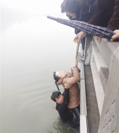赶到现场后,大家发现一名中年女子正在湖水中挣扎。“我会水,我来救”,潘超一把扯下棉袄,跳入冰冷的湖水中,抓起女子奋力向上托举。与此同时,守在桥面上的众人找来一根长木棍,递到女子手边。在众人的合力下,女子很快被救上岸。这时,120救护车闻讯赶到,将女子接到医院救治。
