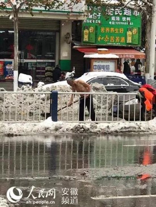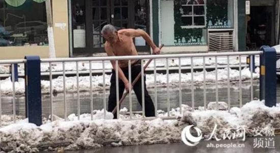 原标题:阜阳环卫工光膀子扫雪走红:浑身冒汗不舒服,脱掉上衣继续干