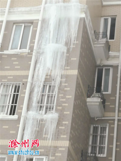 南谯区腰铺镇北苑小区一栋楼房外墙上的冰棱。 王海龙 摄