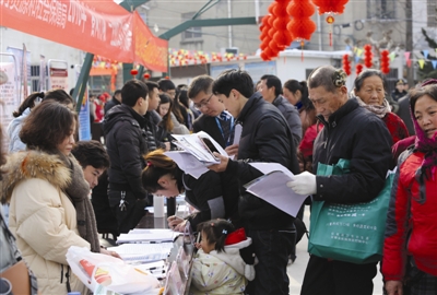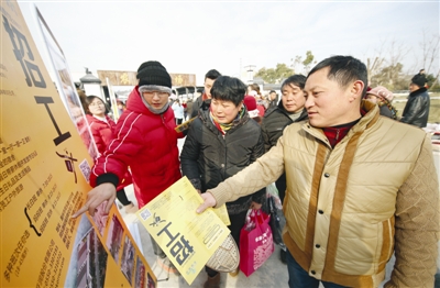 近日,企业招聘人员在为南谯区珠龙镇赶集的居民介绍岗位情况。南谯区抓住外出务工人员回乡过年和群众赶集的有利时机,组织30多家单位开展春风送岗行动,将500多个岗位送到群众家门口。 记者卢志永 特约摄影董 超摄