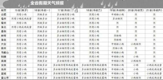 具体预报,今天,全省晴天到多云;明天,全省多云转阴天,淮北地区和江淮之间部分地区有小雨,其中淮北地区北部有雨夹雪。15日,全省大部分地区阴有小雨,其中淮北地区可能会出现雨夹雪。
