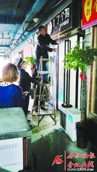 连日来,蜀山区城管部门就针对这些恶俗店名店招开展专项整治行动。11月2日,在蜀山区海卉花市“叫了个鸡”炸鸡店,城管队员将“叫了个鸡”等字样的灯箱广告字从黑色招牌上铲下。
