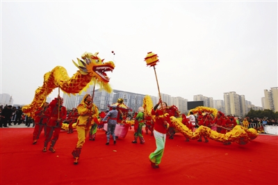 图为大赛现场的旱船表演和舞龙表演。 记者李晓村摄